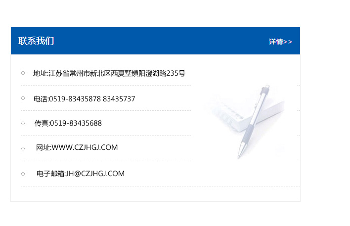 地址:常州市新北區友邦商務大廈1幢16、17層  電話:0519-85101652  傳真:0519-85112595  郵編:213022  網址:www.cz-jiayue_cn.nbjata.com  郵箱:xiajifengaa@163.com